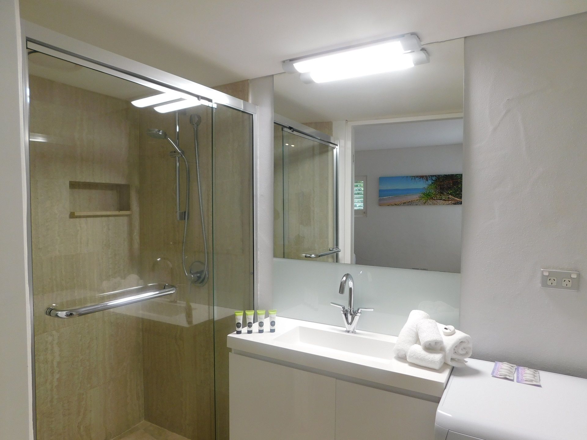 The unit is offered fully furnished, the owners have just added a brand new splash back in the kitchen and mirror work to the bathroom, creating a very clean and modern feel.
